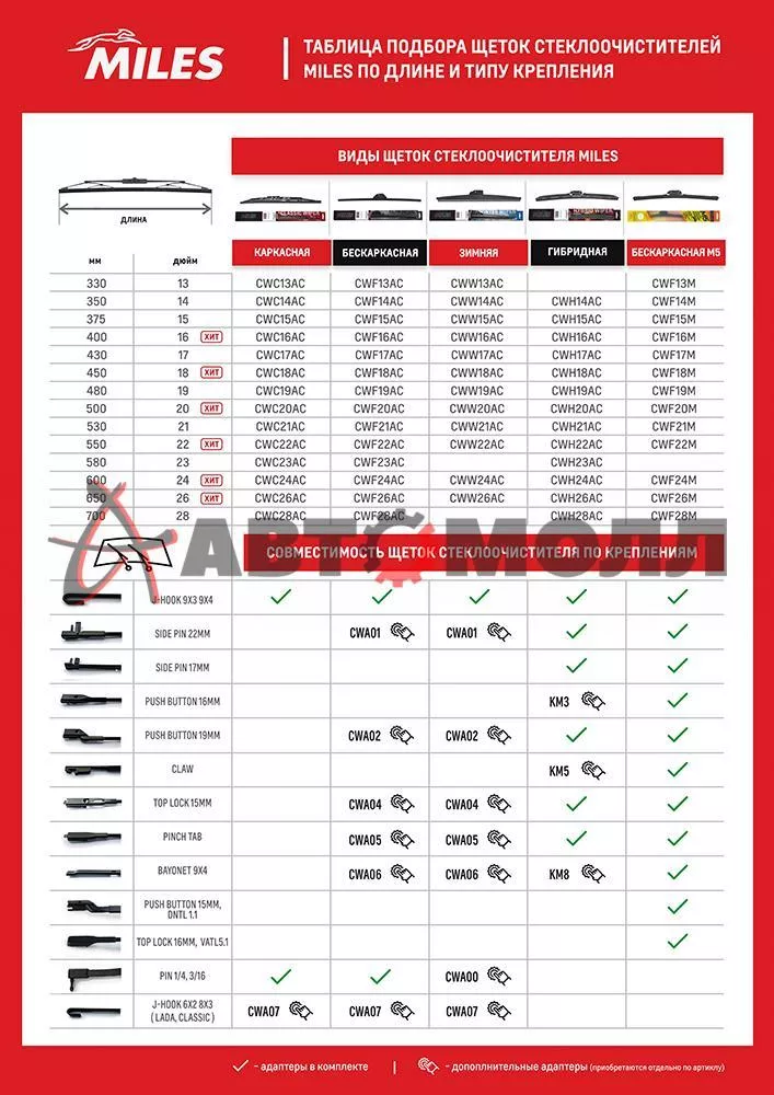 CWA00 Адаптер для крепления щетки стеклоочистителя «PIN 1/4, 3/16» (приобретается отдельно); CWA01 Адаптер для крепления щетки стеклоочистителя «SIDE PIN 22мм» (приобретается отдельно); CWA02 Адаптер для крепления щетки стеклоочистителя «PUSH BUTTON 19mm» (приобретается отдельно); CWA04 Адаптер для крепления щетки стеклоочистителя «TOP LOCK 15mm» (приобретается отдельно); CWA05 Адаптер для крепления щетки стеклоочистителя «PINCH TAB» (приобретается отдельно); CWA06 Адаптер для крепления щетки стеклоочистителя «BAYONET 9×4» (приобретается отдельно); CWA07 Адаптер для крепления щетки стеклоочистителя «HOOK 6×2/8×3 Lada, Classic» (приобретается отдельно)